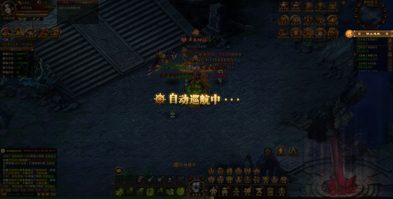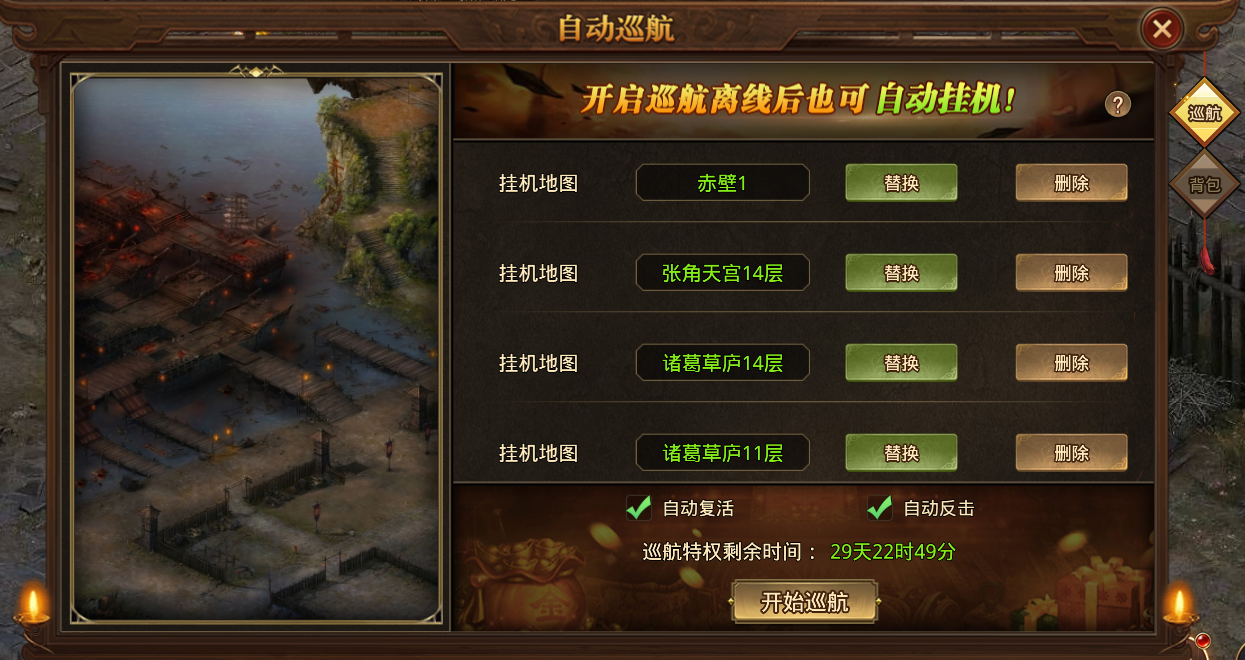 (1) 开通自动巡航功能后,点击开始巡航,将会根据设置自动前往地图进行挂机