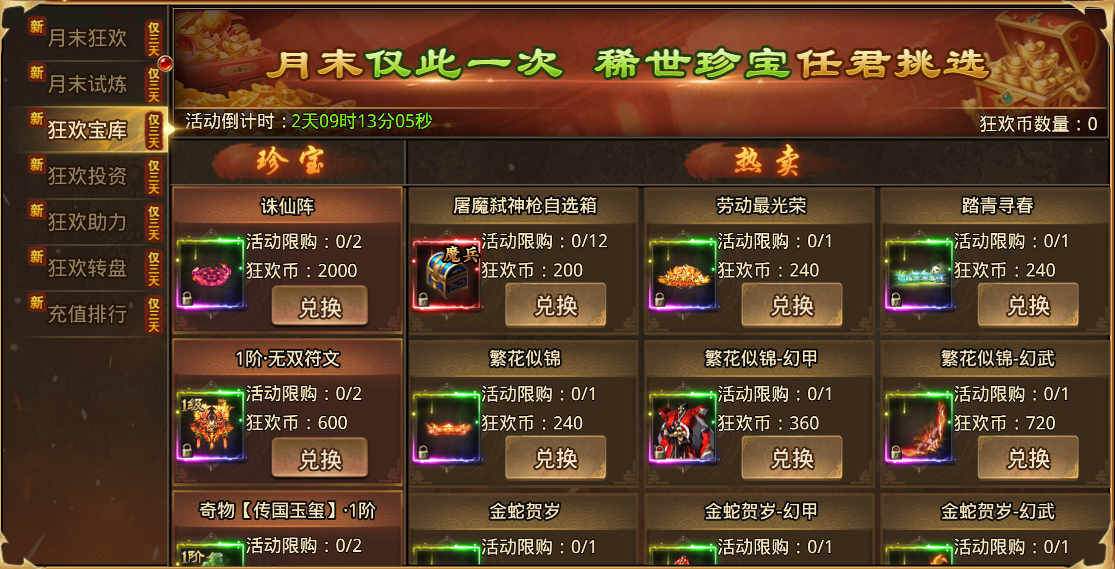 使用狂欢币兑换狂欢宝库奖励,诛仙阵、无双符文等稀有豪礼等你兑换,机不可失!