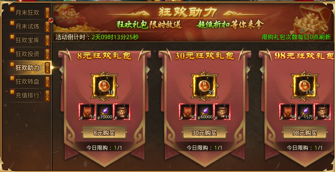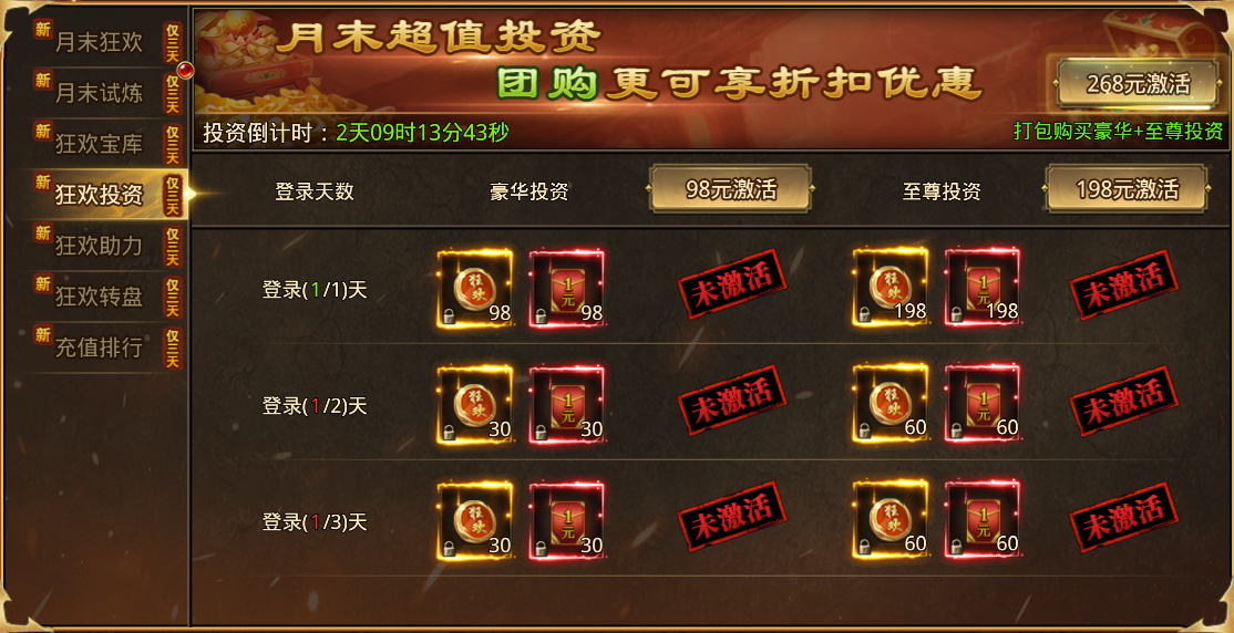 活动期间开启重磅双重投资,只要购买就能在3天拿满全部投资奖励。活动期间98元直购豪华投资,198元直购至尊投资,打包购买268元,立省28元。