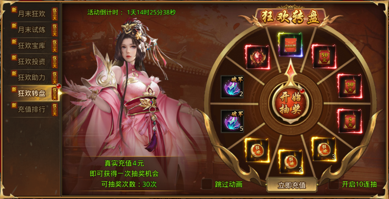 狂欢转盘限时开启,活动期间每真实充值10元,可转动转盘一次,888元红包、仙缘水晶、破军宝石、狂欢币等你来拿!
