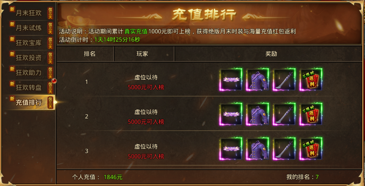 狂欢充值排行,活动期间真实充值排行榜,累计真实充值1000元即可入榜,月末时装、称号,海量红包返利等你来拿!