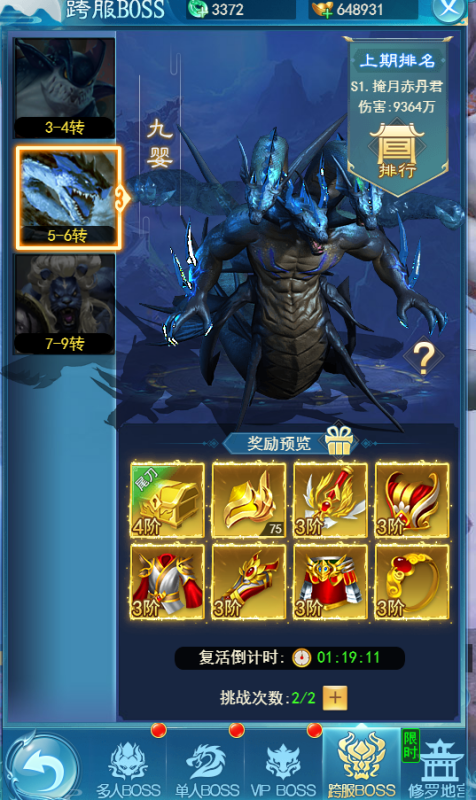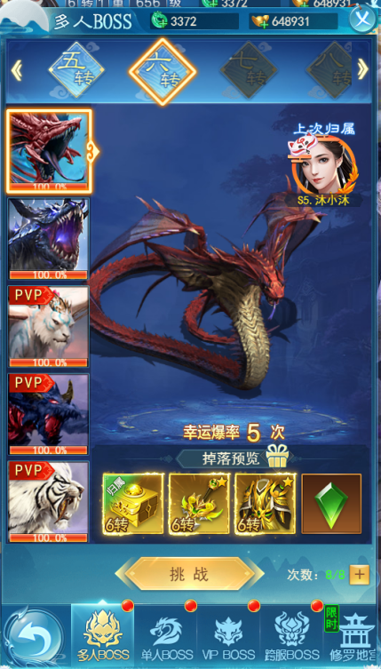BOSS系统里有多人BOSS、单人BOSS、VIP BOSS、跨服BOSS以及修罗地宫,每个BOSS相应的奖励都不一样,也有根据转生等级的BOSS给相应转生等级的奖励,下面我先介绍一下多人BOSS吧~