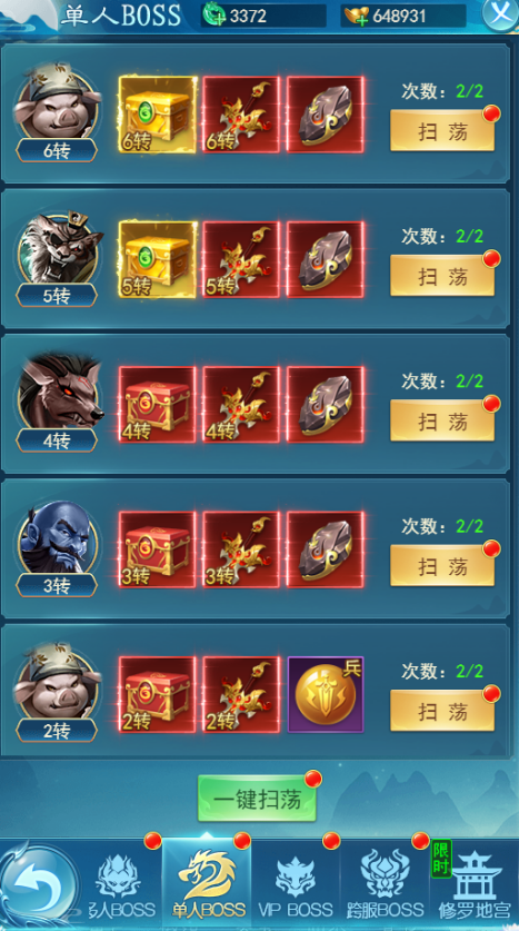 单人BOSS:顾名思义只能单人击杀的副本,需要修仙一转后开启,在击杀过的BOSS之后是可以选择扫荡,打打减少玩家的击杀时间,奖励也是非常丰富的,也有相应转生等级的装备以及各种装备材料,建议玩家要多参与哦!