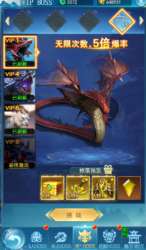 VIPBOSS:需要玩家修仙达到1转开启,是根据VIP等级进行的BOSS副本,VIP等级越高,BOSS越多,而且是无限次数,5倍爆率,玩家有条件可以多去击杀VIPBOSS,因为它真的太香啦~装备品质也是非常高的,而且特别容易爆出来!这不是每个玩家所希望的吗!