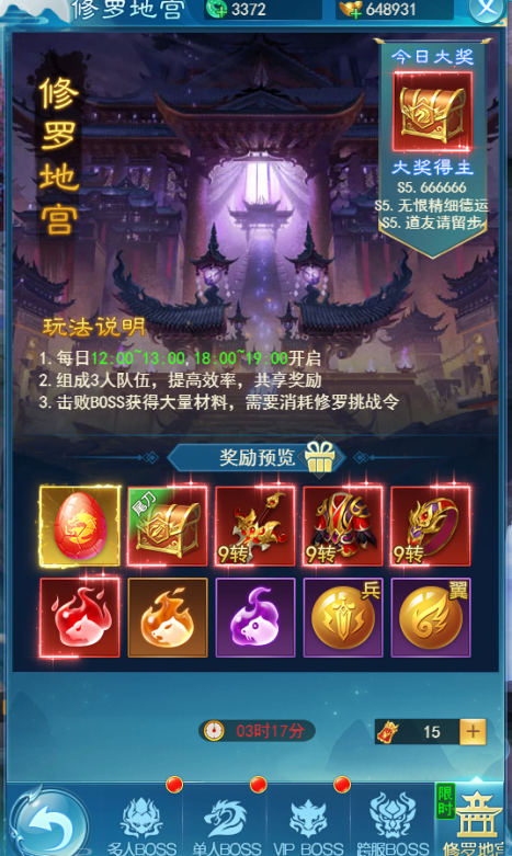修罗地宫:需要玩家修仙达到2转开启,修罗地宫是每日12:00~13:00,18:00~19:00开启的,可以组队3人进行参与,提高效率,奖励也是共享的哦。不过需要消耗修罗挑战令,玩家最好多存一点跟其他玩家组队一起参加,奖励也是非常丰富的,不仅有装备跟材料,还有地宫宝匣,以及上古血蛋!
