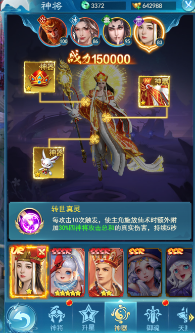 神器系统是每个神将独有的神器,佩戴上会有额外的战力,每个星级套装会有不同的效果,集齐满星一套可以增加额外的技能效果哦。