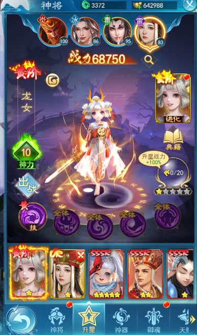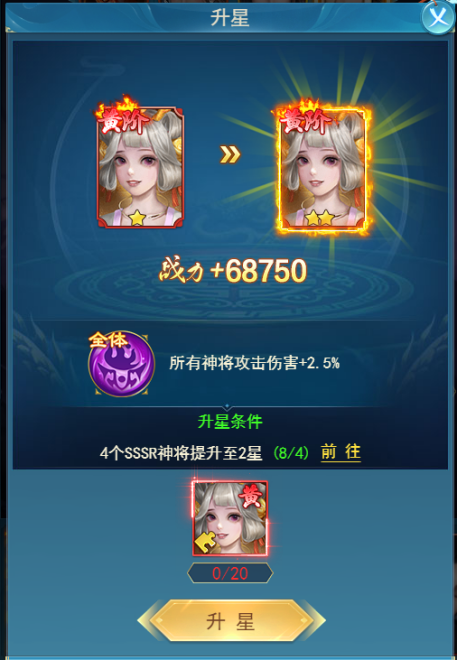 升星系统是由一张已激活的神将基础上,有多余的神将,进行神将升星,可以让神将在原有的属性上增加更多的战力,以及技能伤害增加,是个非常不错的提升,升到一定的星级会增加一些特殊属性以及额外技能的效果哦~