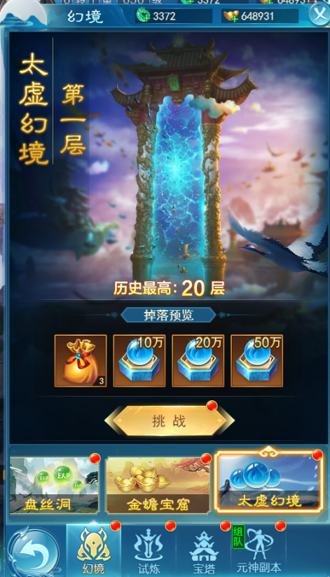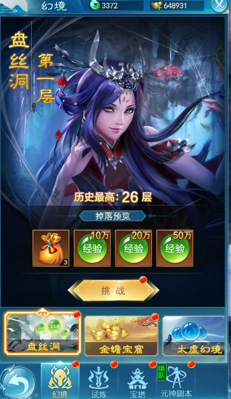 首先试炼里的幻境:盘丝洞,是获得前期获得经验最重要的副本,通关主线关卡第6关开启,需要玩家挑战每层的领主达到下一层,挑战层数越高,经验自然越多,建议玩家可以提高了战力之后再进行参与,因为盘丝洞每天挑战次数有限,尽量在自己战力较高的情况下去进行挑战,毕竟层数越高经验越高,比别人先升级才是王道!而且不仅有经验,还有额外的宝袋能获得召唤卷以及各种材料哦!