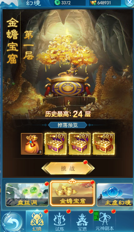 金蟾宝窟,通关主线关卡第41关开启,跟盘丝洞一样的挑战次数,层数越高也是奖励越多,所以玩家可以在战力高的时候同时挑战金蟾宝窟哦!