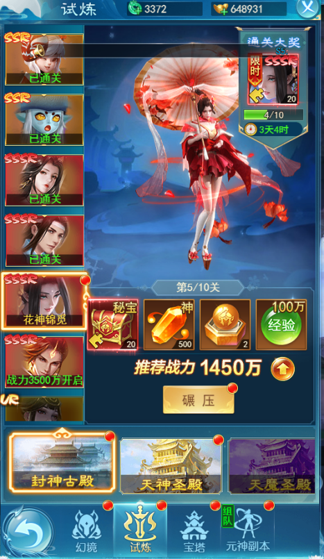 现在来到了试炼环节,试炼是需要通关的,每次通关之后有通关大奖,能获得强力的神将碎片,每层全部通过直接可以兑换一个神将了。而且战力较高的情况下还能直接碾压,大大减少玩家的时间,非常方便,而且也能获得各种材料以及经验!材料神将经验通通都有!