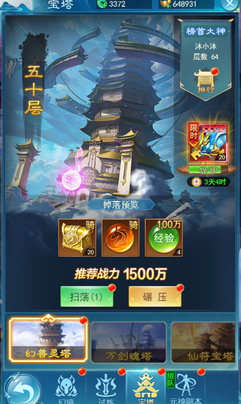宝塔:顾名思义就是要扫塔了!每座塔都有各种不同的奖励,达到一定的层数还有强力的碎片,每天还能进行扫荡,经验也是非常多的!建议玩家每天都来参与一下!