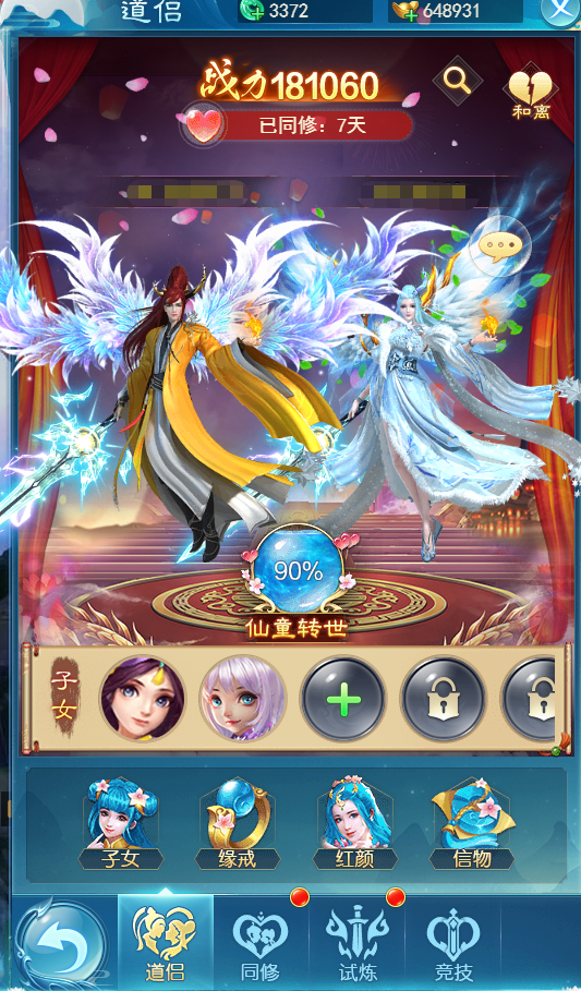 道侣:游戏内点击姻缘系统,向您心仪的对象求婚即可。这里显示玩家与伴侣的界面,可以显示玩家结婚后的战力加成,还有子女系统,伴侣可以获得子女获得额外的子女战力。