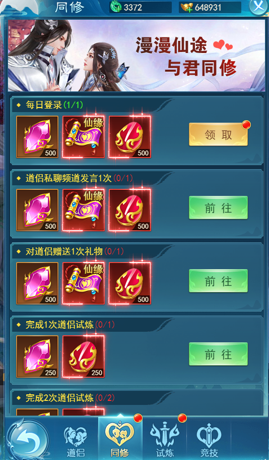 同修:可以理解为是道侣的任务,每天完成任务能获得三生石以及仙胎灵髓。