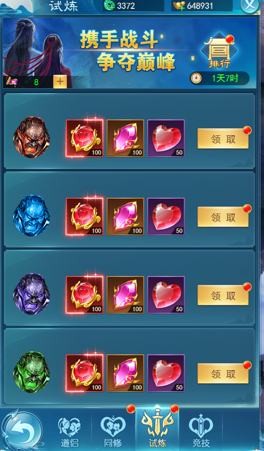 试炼:这个就可以理解为道侣的副本了,也是可以获得道侣系统的各种材料进行强化升级的。
