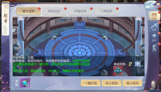 打经验副本组队还可以加成哦,最多可组5人,组队人数越多得到经验越多,有VIP3 每天还可以多买一次经验副本哦.