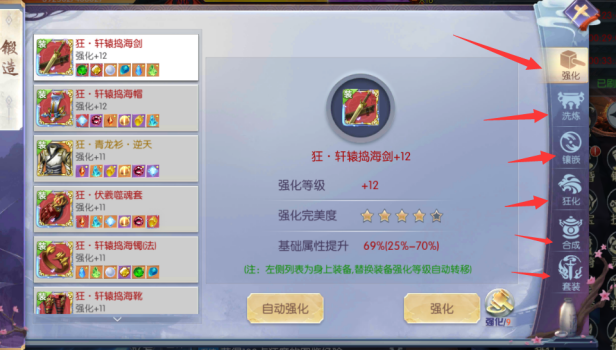2、战力提升、战力提升的地方比较多,主还是锻造系统,强化、洗练、宝石、狂化、合成、套装, 各有各个进阶系统。