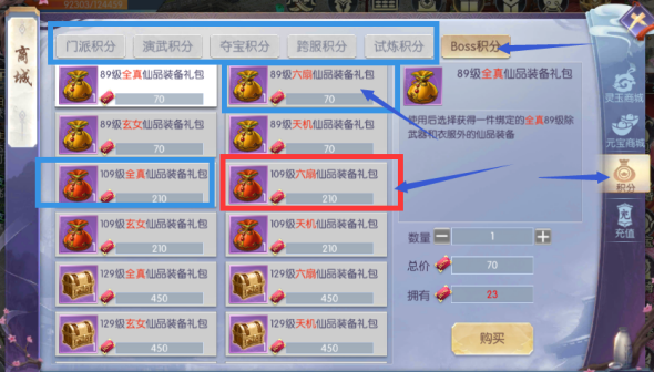3、在商城中有积分-BOSS积分还可以换红色装备哦(注意思换装备时选好职业及装备级别