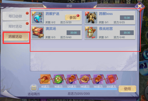 跨服帮派战、PVP(演武场,夜战地宫、3天后开启跨服)、跨服3V3竞技赛、跨服夺旗战、跨服美女护送、PVE: 跨服BOSS资源抢夺战、门派闯关、每天有各种不同的跨服玩法。