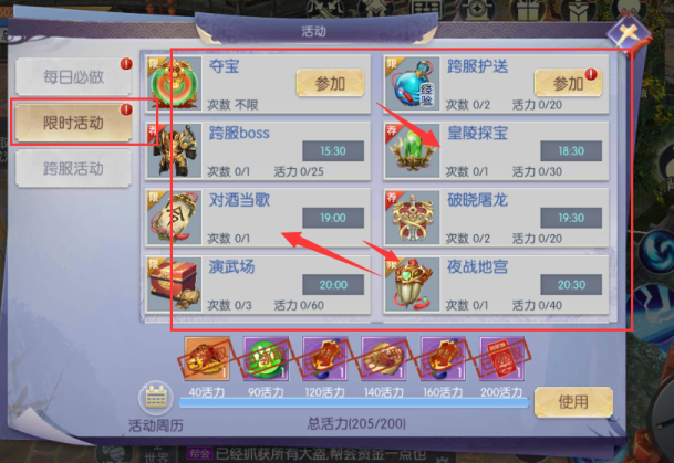 2、限时活动奖励也特别多哦,比喻 皇陵探宝:至少也可以得到2000多元宝,各倍大侠一定要参加哦。上午11:00 -11:30错过的也不用紧,晚上6:30- 7:00 还有这个活动!
