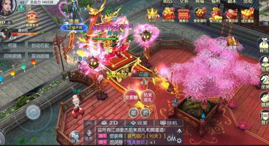 游戏到62级就开放结婚功能,男女双方先加好友-组队,由队长带队前往金陵城找NPC苏小小(求婚),普通婚礼只花588元宝(相当免费),还有688灵玉、豪华婚礼只需1888个灵玉,及世纪婚、婚礼档次越高增加战力越多。世纪、豪华婚礼还可以游街、办婚宴酒席哦,可以邀请各位亲朋友好友前来婚宴现场喝喜酒,还加有加经验、捡元宝。