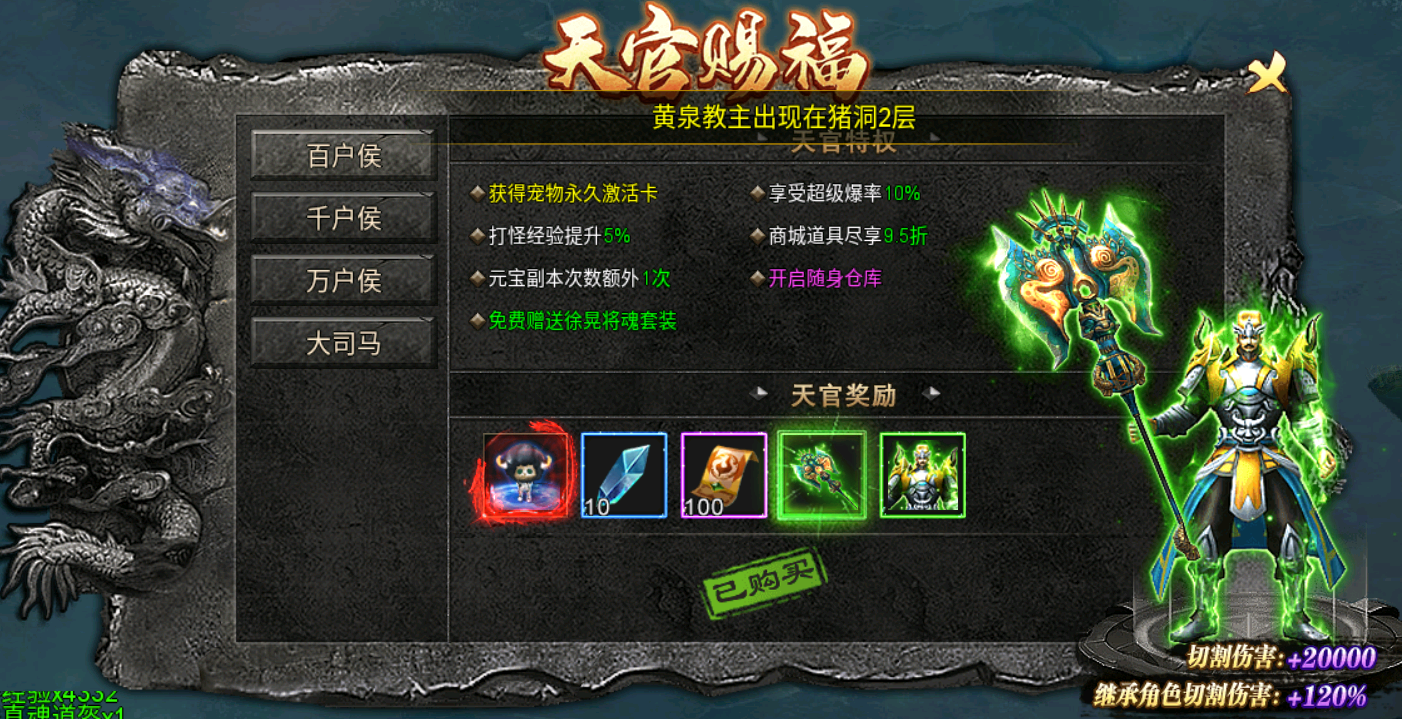 3. 天官赐福共分9档:冰冻属性、全套武将、稀有时装、幻武、随身仓库、自动拾取、商城折扣等等属性