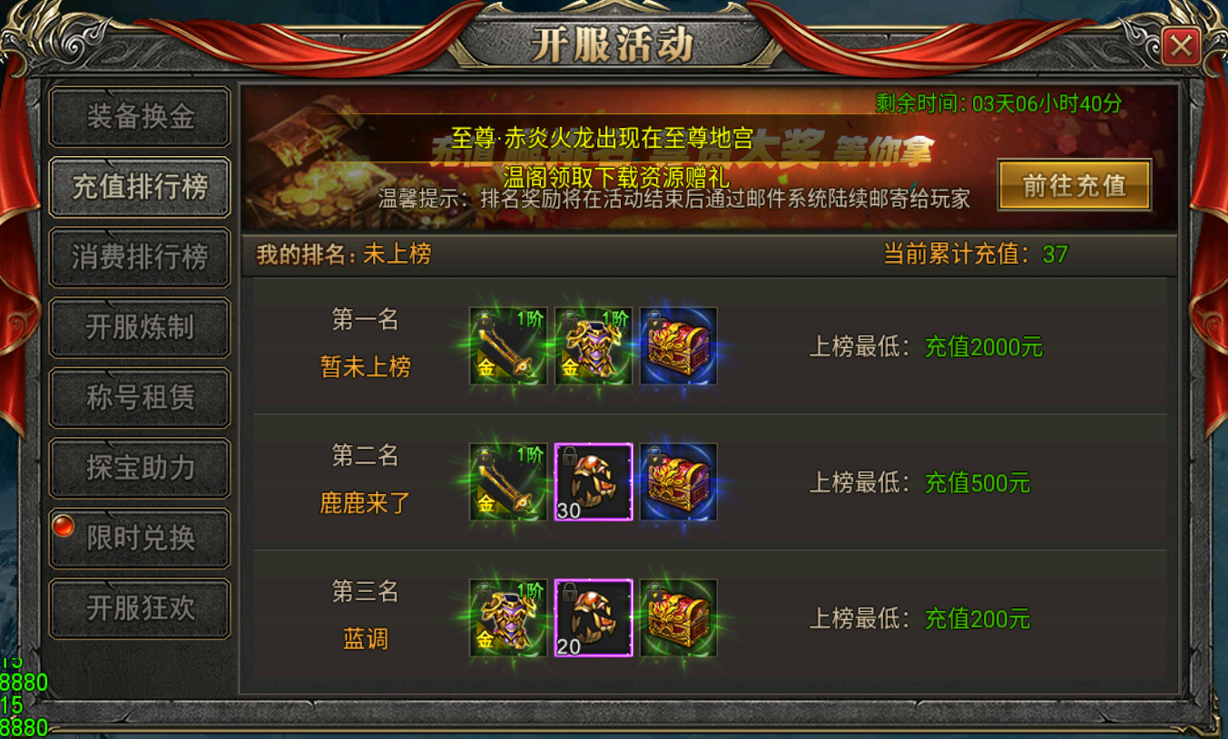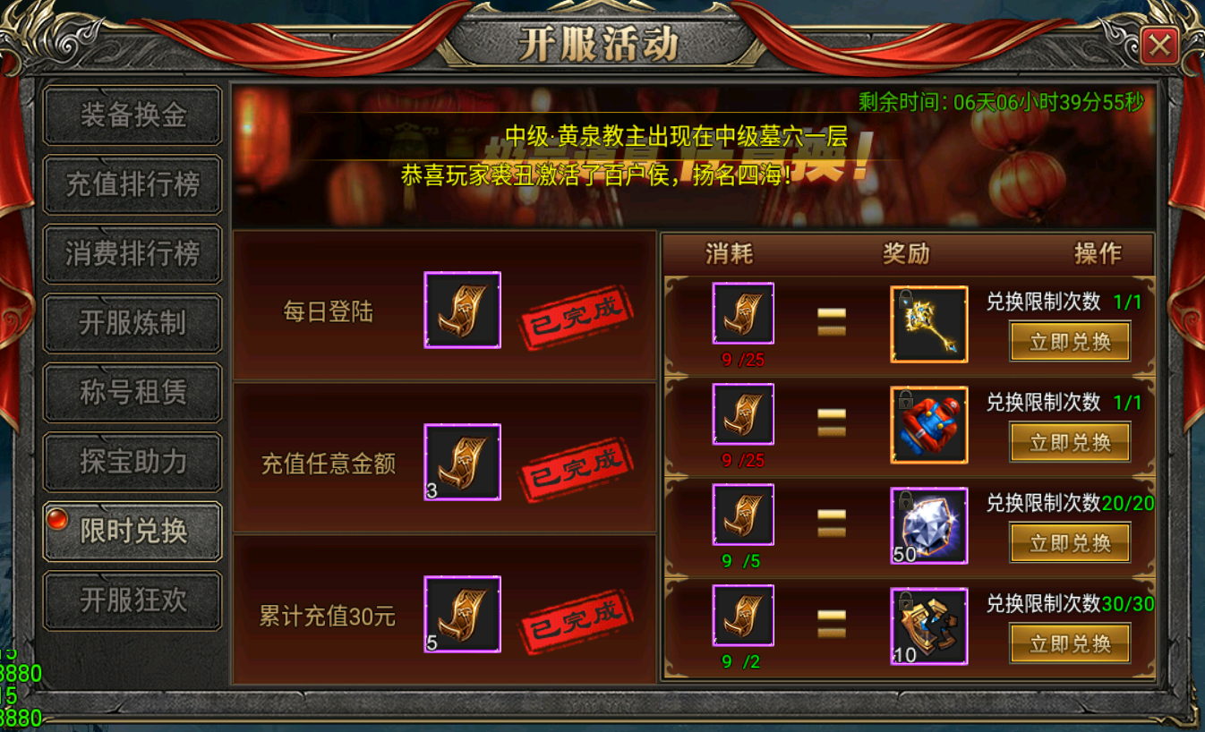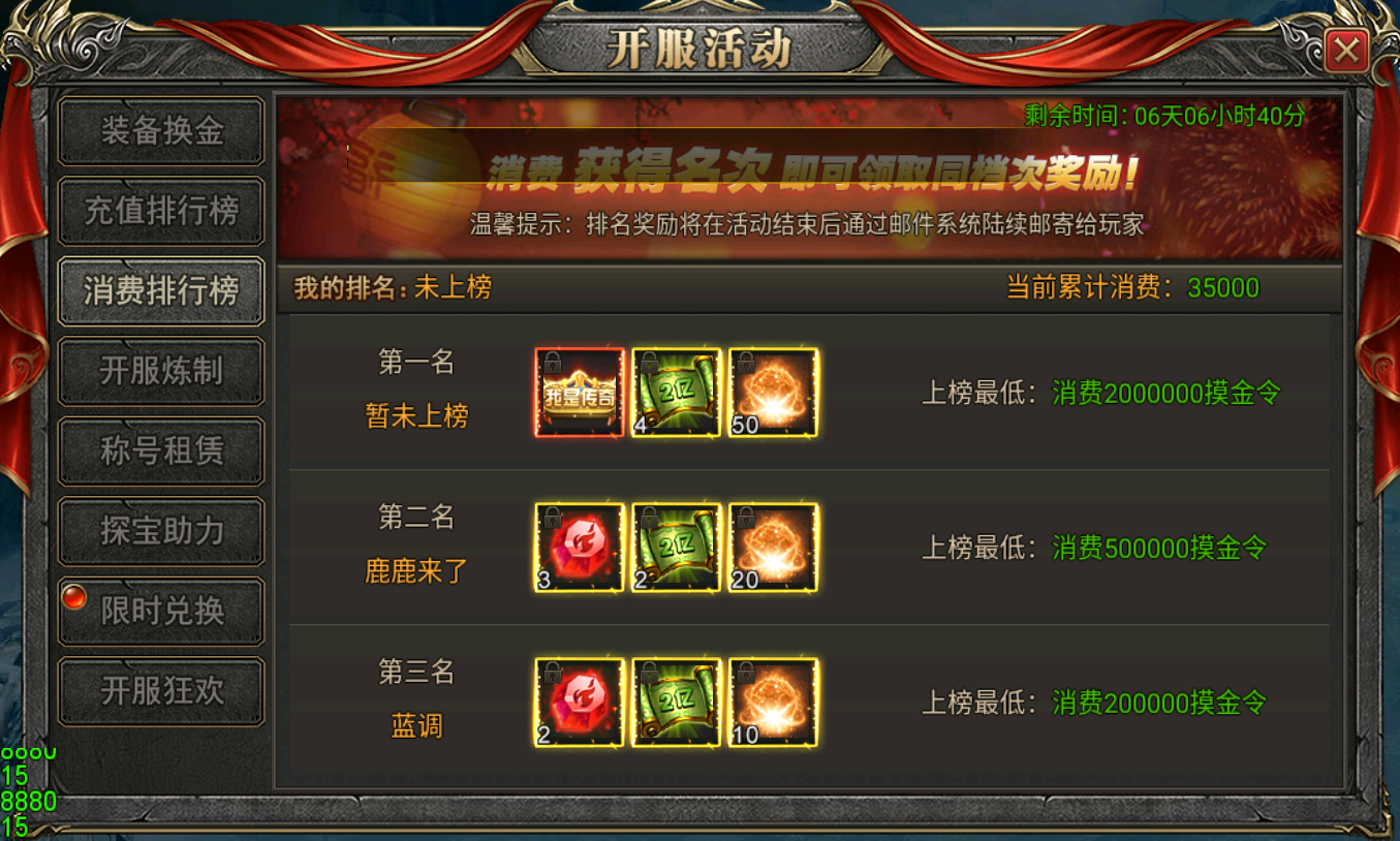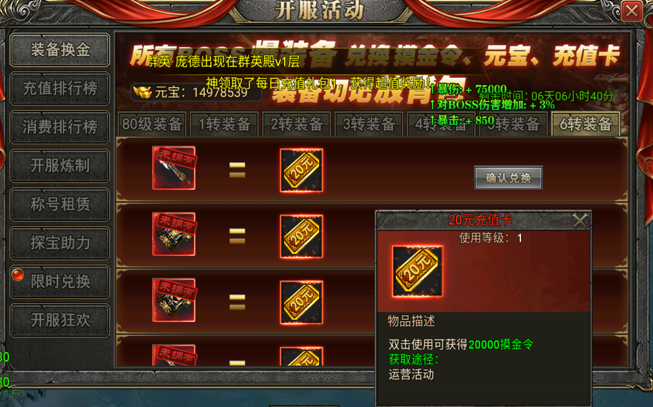 6. 开服活动:装备换金、充值排行榜、消费排行榜、称号租聘、探宝助力、限时兑换