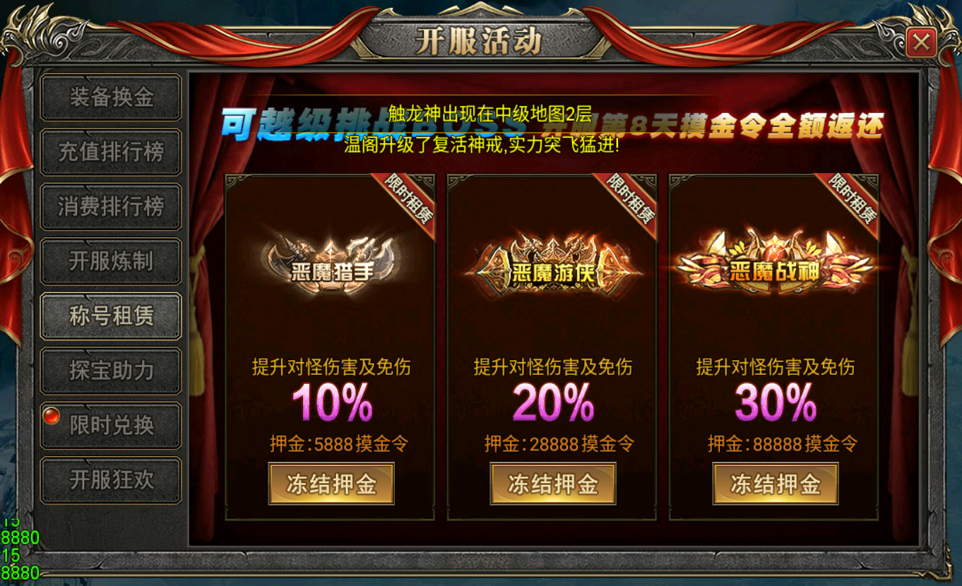(3. 称号租聘:开服期间租聘可获得对BOSS高额百分比增伤、减伤,租聘消费第8天全额返还