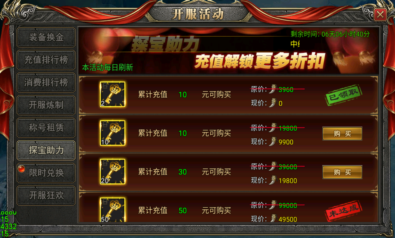 (4. 探宝助力:每日充值可享受对应档位5折寻宝钥匙购买,可5折参与“寻宝回馈”活动